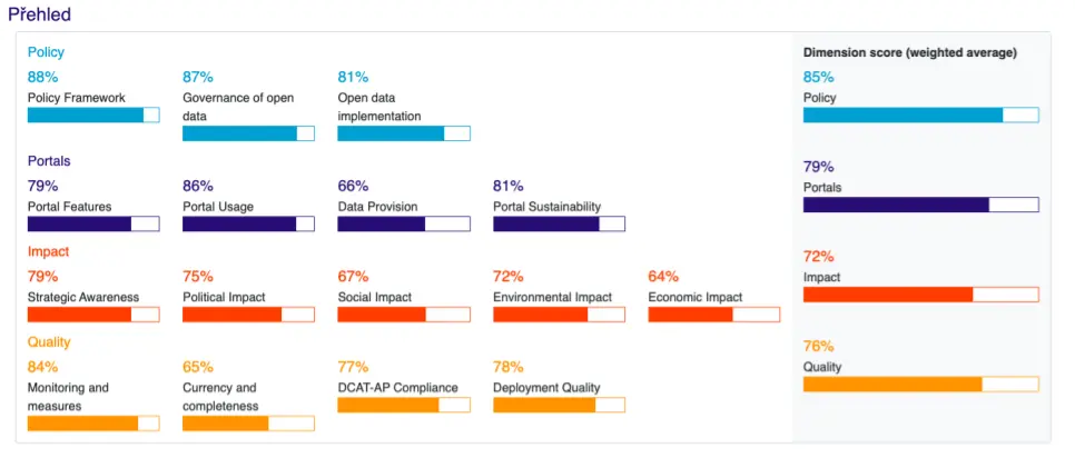 Při podrobnějším pohledu na detailní report o České republice vidíme, že Česko celkově ztrácí 6 % na evropský průměr, který činí 78 %. Nejlépe si vedeme v kategorii politik (Policy), kde ztrácíme dvě procenta na evropský průměr. Nejvíce ztrácíme v kategorii portálů (Portal), kde jsme na 30. místě v Evropě. Hlavní příčinou nižšího počtu bodů je fakt, že tato hodnotící metrika vyžaduje velmi podrobné informace o návštěvnících národních portálů v jednotlivých členských státech EU. Nicméně právě z toho důvodu, že český Portál otevřených dat tyto informace záměrně nesbírá, nemůže být adekvátně ohodnocen.