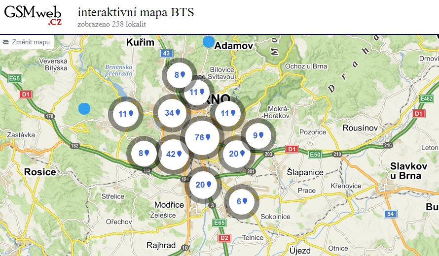 Interaktivní mapu stanic BTS je možné nalézt na webu GSMweb, kde jsou zmapované stanice kategorizovány dle jednotlivých poskytovatelů. Níže na obrázku je výřez mapy sítí BTS společnosti T-Mobile v Brně. Data jsou na webu i ke stažení.