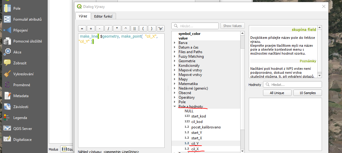 Dostaneme tak příkaz make_line( $geometry, make_point( "cil_X", "cil_Y" )). Klikneme na “použít”.